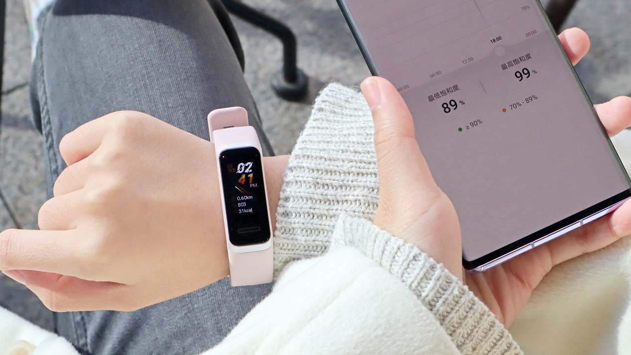 健康功能方面,华为手环4重点升级了血氧饱和度监测功能,在手环上即可实现随时随地检测自身的血氧浓度。很多小伙伴不知道血氧浓度的重要性。作为重要的生命体征之一,它可以反映机体供氧状况,如果血氧浓度不足的话很容易引起眩晕、心跳加快、嗜睡等症状(电视剧中抢救病人夹在手指就是为了检测血氧浓度)。尤其对于高强度脑力劳动者,在长时间室内工作的时候更应该随时检测一下血氧浓度,如果降到90%以下就要赶快休息一下,呼吸呼吸新鲜空气,从而调整自身状态,以防意外情况发生。
